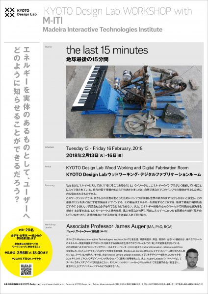 KYOTO Design Lab[D-lab]は、下記の日程で、RCAデザイン・インタラクションズでアンソニー・ダンとともに教鞭をとった、M-ITIのジェームズ・オージャー准教授をお招きし、デザインワークショップ「the last 15 minutes – 地球最後の15分間」を開催いたします。